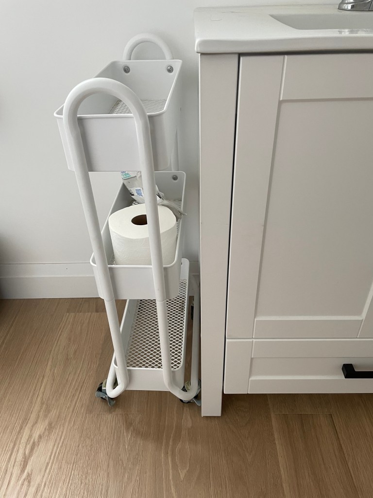- I stocked our rolling cart with more toilet paper, additional baby wipes, diapers, and towels